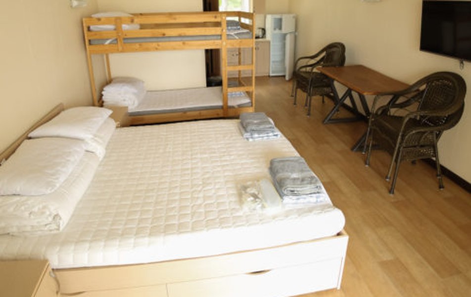 В номере: кровати односпальные /одна двуспальная кровать, кровать двухъярусная, кухонная мебель, прикроватные тумбочки, стол, стулья, мини-кухня, кондиционер, мини-холодильник, набор посуды, плита электрическая, телевизор, электрочайник
