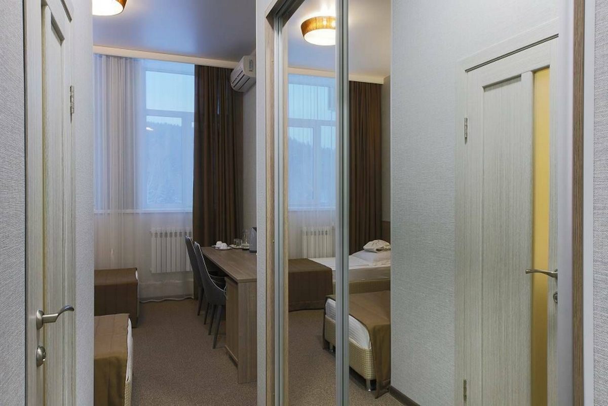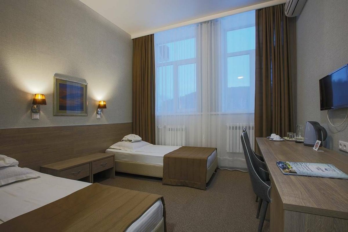Оснащение номера: односпальные кровати или одна двуспальная, прикроватные тумбы, стол, стулья, шкаф для одежды, набор посуды, телевизор, телефон, холодильник, электрический чайник, сейф