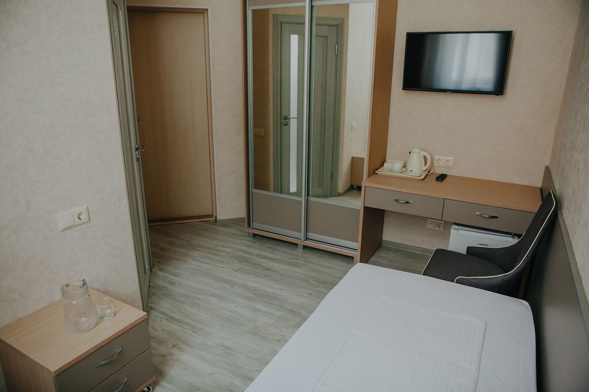 Оснащение номера: односпальная кровать, прикроватная тумбочка, стол, стулья, шкаф для одежды, набор посуды, кондиционер, телевизор, телефон, холодильник, электрический чайник, сейф