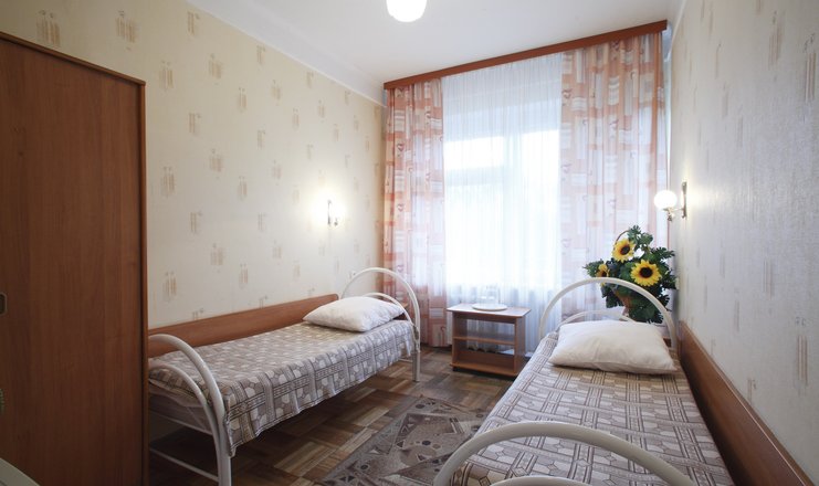 В номере: кровати односпальные, прикроватные тумбочки, стол, стул, шкаф, телевизор, холодильник