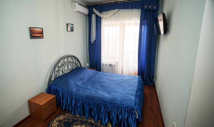 В номере: шкаф-купе, стол-тумба, 2 стула, кровать 1,20 м., ЖК телевизор, кондиционер, холодильник, зеркало, вешалка для верхней одежды.