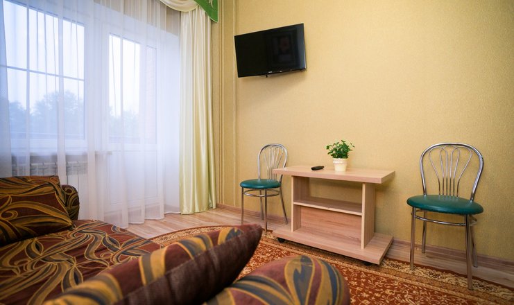 В номере: Гостиная, совмещенная с прихожей и мини-кухней: раскладной диван, журнальный столик, ЖК телевизор, 2 стула, шкаф-купе, вешалка для верхней одежды.