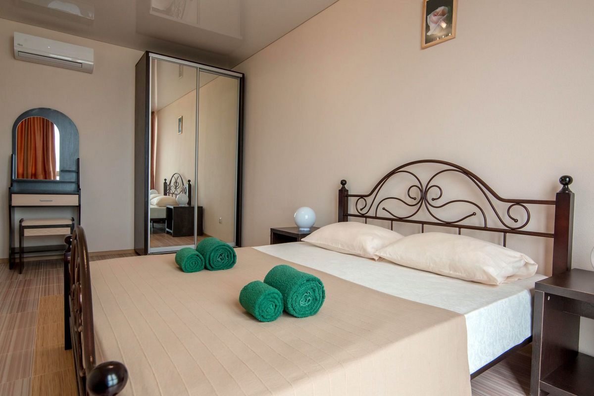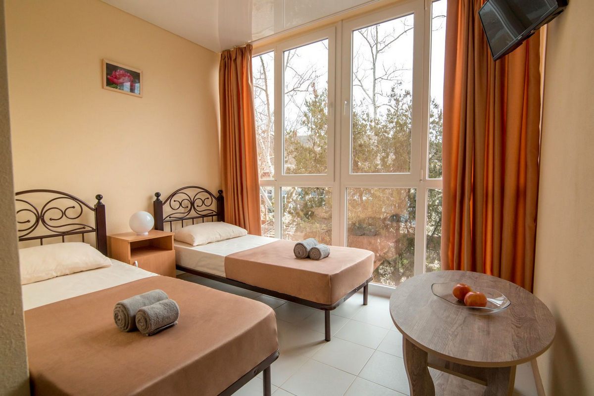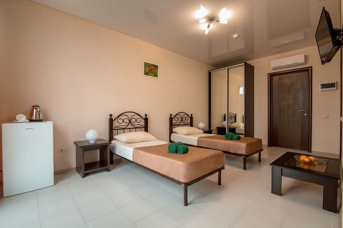В номере: двуспальная кровать или две односпальные, прикроватные тумбы, стол, шкаф для одежды, кондиционер, ЖК телевизор, Wi-Fi, холодильник, электрочайник